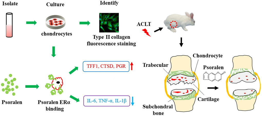 Therefore, this study aims to explore the mechanism by which psoralen inhibits the inflammatory response in chondrocytes and its effects on cartilage and subchondral bone in OA. The findings preliminarily suggest that psoralen inhibits the inflammation in chondrocytes by activating estrogen receptors. Further experiments showed that it promoted the regeneration of rabbit OA cartilage as well as the recovery of subchondral bone mass.