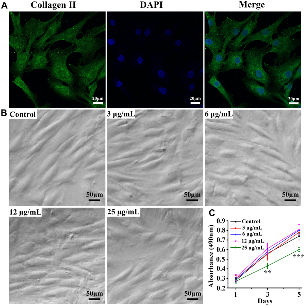 Whether the extracted primary cells were chondrocytes, type II collagen immunofluorescence staining was performed. As displayed in Figure 1A, the cultured cells were positive for collagen II fluorescence staining. Further, we also observed the proliferation of cells in Figure 1B. The morphology and growth of cells were observed on day 5 under an inverted phase-contrast microscope. The cells had a spindled or polygonal shape. At a psoralen concentration equal to 25 μg/mL, the number of cells was significantly reduced as shown in Figure 1C. The proliferation of cells was quantified on days 1, 3 and 5 by MTT assay. When the psoralen concentration was less than 12 μg/mL, it did not affect chondrocyte proliferation. On the other hand, when the concentration equaled 25 μg/mL, it inhibited the proliferation of chondrocytes remarkably, and the difference was statistically significant. Therefore, a dose of 12 μg/mL was selected as the optimal concentration.
