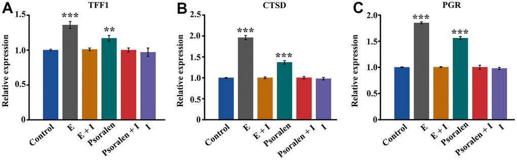 Expression of estrogen target genes TFF1, CTSD, PGR was assessed by RT-PCR. As shown in Figure 2A, the expression of TFF1 in the estrogen group was significantly higher than that in the control group, and the difference was statistically significant. The expression of TFF1 in the psoralen group was also higher than that in the control group, and the difference was statistically significant. After the addition of estrogen receptor antagonists, the expression of TFF1 in both estrogen + I group and psoralen + I group compared with the control group did not change significantly. Similar results were obtained as in Figure 2B, 2C. Estrogen and psoralen were able to promote TFF1, CTSD and PGR expression, however, this effect was abolished by the addition of an estrogen receptor antagonist.