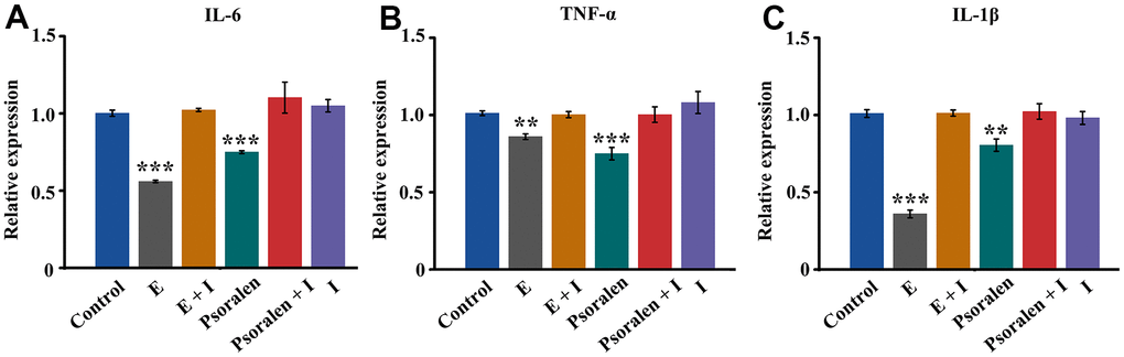 Second passage OA chondrocytes were incubated with estradiol (E2, Aladdin, China) 10-8 μM, psoralen 12 μg/mL, estrogen receptor antagonist (fulvestrant, ICI182780) (Beyotime Biotech, China) 1 μM, Estradiol 10-8 M + estrogen receptor antagonist 1 μM, Psoralen 12 μg/mL + estrogen receptor antagonist 1 μM. After the cells were cultured for 5d, real-time quantitative polymerase chain reaction (PCR) was performed according to the manufacturer’s instructions using the manual. In brief, the total RNA was firstly extracted and the RNA concentration was further examined, and the nanodrop2000 software was applied for the assay. Subsequently, 1.0 μg/μL total RNA to synthesize cDNA by the operation instructions of reverse transcription kit (TAKARA). The setup program was to perform reverse transcription at 37° C for 15 min, followed by termination of the reaction at 85° C for 5 s. Finally, the DNA amplification process was performed using a Step one Plus real-time PCR system (Applied Biosystems). The required primers included GAPDH, TFF1, CTSD, PGR, TNF α, IL-1 β, IL-6. The amount of relative expression of genes was calculated using 2-ddct and normalized using the internal reference gene GAPDH. Primer sequences are shown in Table 1.