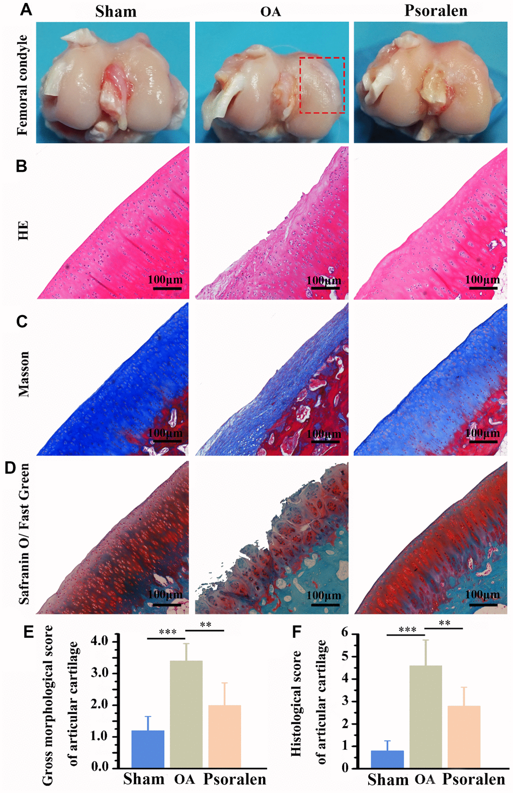 In Figure 4A, compared with the sham group, the cartilage surface of the femoral condyle in the OA group is uneven, locally concave and edematous. However, the psoralen group had only a little edema and slight damage to the cartilage surface. As demonstrated in Figure 4B–4D, the cartilage tissue was stained with HE, Masson and Safranine o/fast green respectively. Compared with the sham group, the OA group has obvious cartilage destruction, cartilage reduction and cartilage thickness reduction. The cartilage structure of the psoralen group was better than that of the OA group, cartilage thickness in the psoralen group was similar to the sham group. Further quantitative score statistics displayed that the gross morphological score and the historical score of the psoralen group were lower than that of the OA group (P < 0.01) as shown in Figure 4E, 4F. The results indicated that psoralen promoted cartilage regeneration.