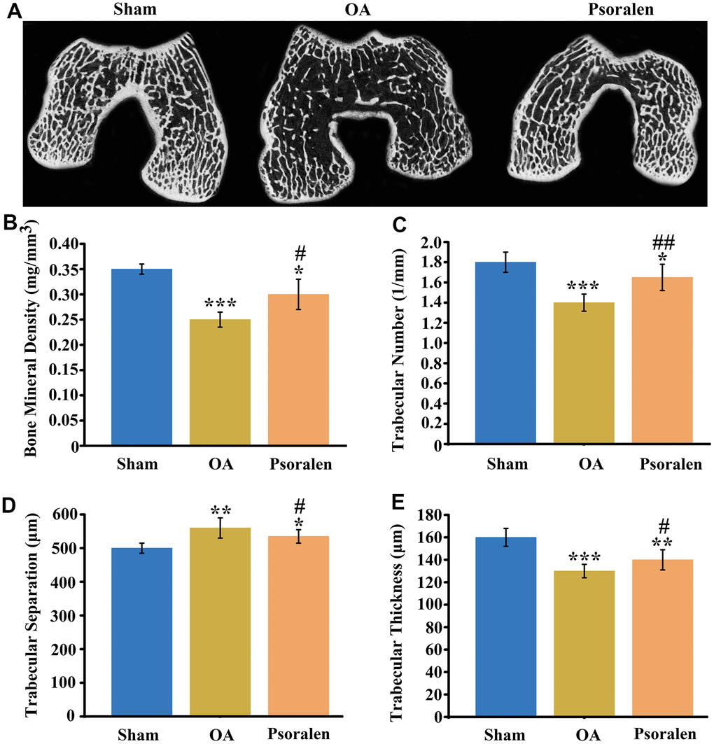 Cross-sectional images of the subchondral bone of femoral condyle were obtained by CT scanning. As shown in Figure 5A, cross-sectional images indicated that the subchondral bone in group OA was significant vacuoles, and the number of trabecular bones was reduced and irregular in comparison with the sham group. The number of trabecular bones increased in the psoralen group compared with the OA group, and no obvious cavity-like changes were observed. Quantitative statistical results of BMD, trabecular number, trabecular separation, trabecular thickness are shown in Figure 5B–5E. The results suggested that BMD, trabecular number, trabecular thickness decreased significantly and trabecular separation increased in the OA and psoralen groups compared with the sham group. However, compared with the OA group, the psoralen group demonstrated significantly higher BMD, trabecular number, trabecular thickness, and decreased trabecular separation.