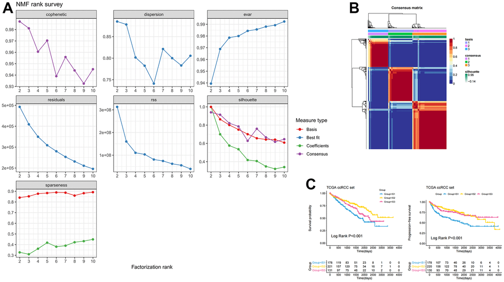 Based on the expression of the screened immune genes, we employed the NMF algorithm to cluster ccRCC samples. The “Brunet” method was applied to select the best number for clustering, and the number of iterations was 30. The point with the first greatest variation of cophenetic value was considered the best number of immune subtypes. In addition, OS and PFS were used to evaluate the reliability of the clustering results. The KM method was employed to analyze differences in survival between different subtypes. All statistical p-values were two-sided, with p <0.05 as statistically critical.