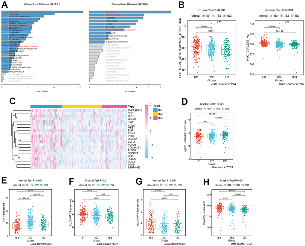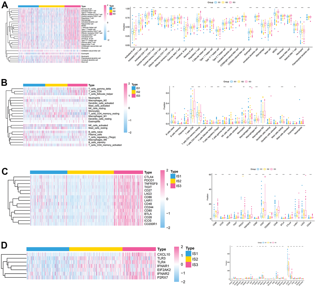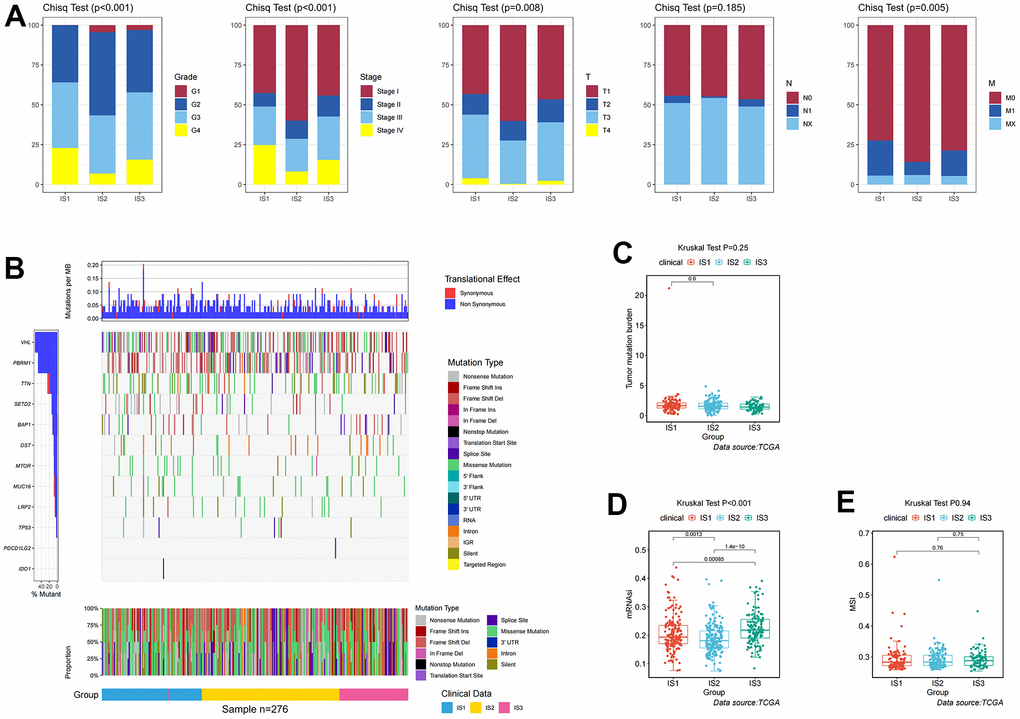 In addition, differences in clinicopathological characteristics between immune subtypes were further analyzed. In IS1 patients, the proportion of advanced clinicopathological characteristics was significantly higher than that of IS2 and IS3 patients, but there was no significant difference in the degree of lymph node involvement among the three groups (Figure 2A). The distribution of the top ten mutants in each population was plotted (Figure 2B). TMB was an effective marker for predicting the response to immunotherapy, and was applied to identify the characteristics of each immune subtype. As shown in Figure 2C, the IS1 group had a higher TMB, followed by the IS2, and the IS3 had a lower TMB, which suggested that IS3 patients were more likely to respond to immune checkpoint inhibitors. However, there was no significant difference in TMB among these three immune subtypes (p =0.28, Figure 2C). After appraising the mRNA expression-based stemness index (mRNAsi), which referred to the similarity between tumor cells and cancer stem cells (CSCs), the results suggested that IS3 had the highest mRNAsi, followed by IS1 and IS2 (p <0.001, Figure 2D). Microsatellite instability (MSI) was characterized by a high frequency of insertions/deletions due to unrepaired DNA polymerase slippage in microsatellite sequences, and may be applied to predict immunotherapy response. The results suggested that IS3 patients had the highest MSI (p =0.94), indicating IS3 patients display a better immunotherapeutic response (Figure 2E).