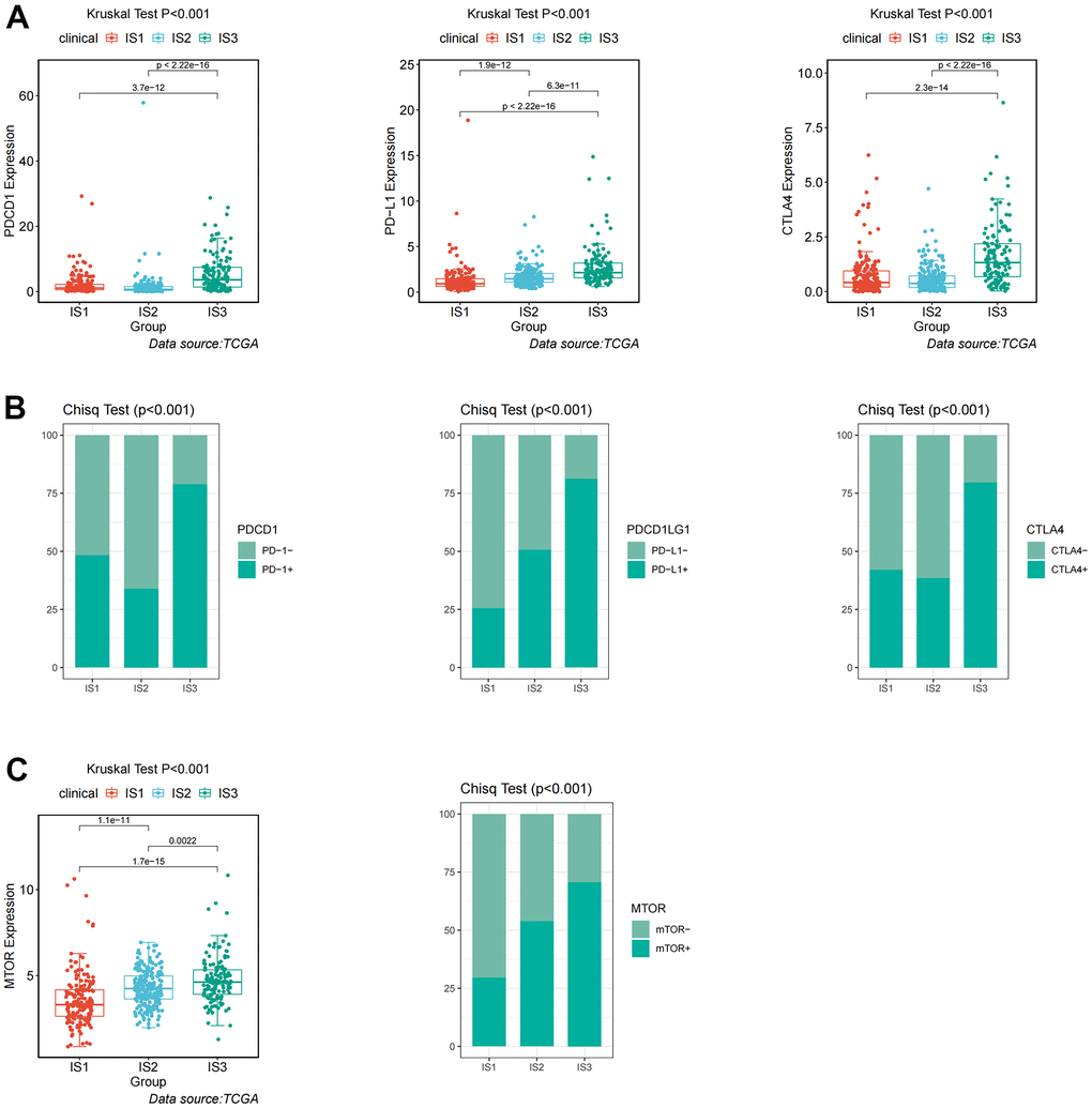 Since tumor immune status is the determinant of immunotherapy response, we further characterized the immune cell components in different subtypes [31, 32]. Compared with IS2 and IS1, IS3 had abundant immune cell infiltration and complex immune microenvironment. These results indicated that IS3 was a “hot” immune phenotype, IS2 was a “cold” immune phenotype, and IS1 was an “intermediate” immune phenotype. The molecular characteristics of these subtypes were consistent with the immune characteristics, indicating that patients with different immune subtypes have different treatment responses. Specifically, the IS3 subtype was associated with higher immune cell infiltration, suggesting more abundant immune components. Immune checkpoints are a class of immunosuppressive molecules that regulate immune responses to avoid the destruction of normal tissues [33, 34]. During tumorigenesis, immune checkpoints are important biomarkers of the immune cell phenotype in the immune microenvironment, which can induce immune cells to develop immune tolerance [35, 36]. Our analysis showed that the IS3 subtype has a high expression of immune checkpoints (PD-1, PD-L1, and CTLA-4), which may afford it a better response to immune checkpoint inhibitors. Furthermore, we found that the mTOR signaling pathway was significantly enriched in the IS3 subtype, suggesting that immune checkpoint inhibitors combined with mTOR inhibitors may be used to treat patients in the IS3 subtype.