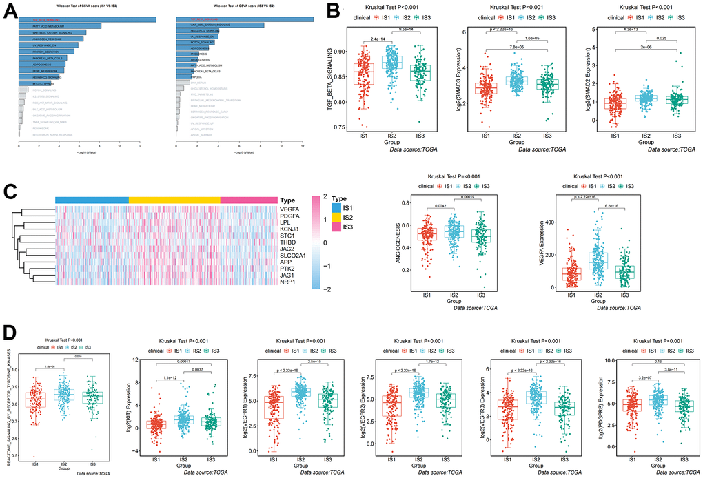 Given the high level of immune complexity of the three immune subtypes, we calculated differences in expression of the most common targets (PD-1, PD-L1, and CTLA4) across immune subtypes, in order to identify potential immunotherapeutic regimens for patients. In IS3, the expression of PD-1, PD-L1, and CTLA4 were higher than in IS1 and IS2 (Figure 4A). Moreover, the ccRCC samples were divided into positive and negative groups, according to the median value of the most common target expression. The ratio plot revealed that the number of highly expressed targets (PD-1+, PD-L1+, and CTLA4+) had the highest proportion in IS3 (Figure 4B). In addition, mammalian target of rapamycin (mTOR), a multi-tumor therapeutic target, was also evaluated. We discovered the abnormally high expression of mTOR in IS3, and the proportion of highly expressed mTOR was the highest in IS3 (Figure 4C). Due to the significantly high expression of immune checkpoints and mTOR, patients in the IS3 group were considered suitable for the combination of immune checkpoints (PD-1, PD-L1, and CTLA4) and mTOR inhibitors, which has been clinically proven to be one of the best immunotherapy regimens available. We further analyzed the differences in biological pathways among the three subtypes, and found that the TGF_BETA_SIGNALING pathway was significantly enriched in the IS2 subtype (Figure 5A). Additionally, the TGF_BETA_SIGNALING pathway and key regulatory genes (SMAD3 and SMAD2) were also observably over-expressed in the IS2 subtype compared to IS1 and IS3 (Figure 5B). We further analyzed expression differences for the ANGIOGENESIS pathway and major regulatory genes among immune subtypes. The results showed that the expression of the ANGIOGENESIS pathway and major regulatory genes were the highest in IS2 (Figure 5C). The same trend was observed in the REACTOME SIGNALING BY RECEPTOR TYROSINE KINASES pathway. Then, we inspected the expression of the tyrosine kinase inhibitor (TKI) pathway targets in the IS2 subtype. It was obvious that the expressions of VEGFA, VEGFR1, VEGFR2, VEGFR3, PDGFRB, and KIT were significantly over-expressed in the IS2 subtype (Figure 5D). Therefore, patients with IS2 ccRCC may be treated with a combination of TKI targeted therapy and antiangiogenic therapy. Given that cases in the IS1 subtype have a higher proportion of patients with a metastatic propensity, we therefore compared the IS1 subtype with the IS2 and IS3 subtypes. The results showed that the DNA_REPAIR, MYC_TARGETS_V2 (MYC), and epithelial-to-mesenchymal transition (EMT) pathways were significantly enriched in IS1 (Figure 6A). Given that IS1 had the highest proportion of metastases, we focused on pathways significantly associated with tumor metastasis (MYC and EMT). Then, we further analyzed the expression differences for EMT and MYC among immune subtypes, which showed that EMT and MYC were the highest in IS1 (Figure 6B). In order to develop a treatment plan for patients with IS1 ccRCC, we analyzed the receptors and drug targets of these signaling pathways, and found that E-cadherin, MMP2, MMP3, and VIM were significantly highly expressed in the IS1 subtype, while TJP1 (ZO-1) had significantly lower expression (Figure 6D–6H). These results revealed that the IS1 population may respond to a combination of EMT inhibitors with c-Myc inhibitors. These subtype characteristics may provide the basis for future clinical treatment.