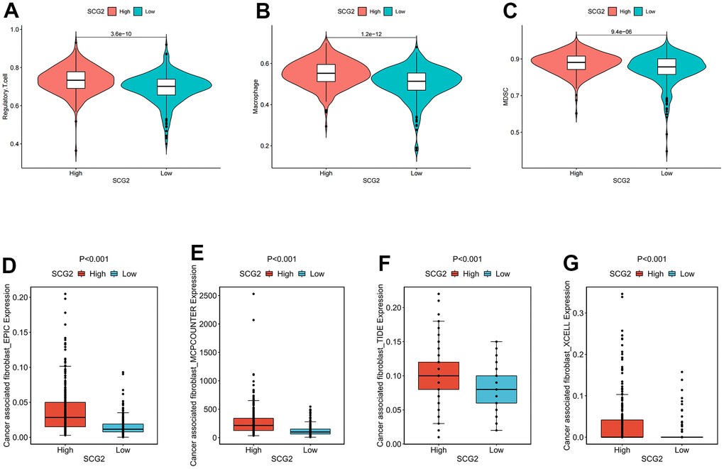 To further investigate the immune signature of SCG2, we first scored immune cells in tumor tissues from 539 patients with ccRCC. The results indicated that SCG2 was significantly positively correlated with immune cells, especially MDSC, macrophages, and Tregs (Figure 8A–8C). Then, CIBERSORT, EPIC, TIDE, and XCELL algorithms were employed to analyze the correlation between SCG2 and CAFs. The results revealed that SCG2 was positively correlated with CAFs (Figure 8D–8G). Then, to further validate the key events leading to tumor development, we analyzed the correlation between SCG2 expression and clinicopathological variables. In the Cancer Genome Atlas (TCGA) cohort, a high expression level of SCG2 was significantly associated with more severe clinical predictors, including histological grade (p <0.001), T stage (p <0.001), and M stage (p <0.05) (Supplementary Figure 2C–2F). The results from the same calculations in the GSE17895, GSE53537, GSE73731, and GSE40435 datasets revealed that SCG2 was significantly over-expressed in patients with ccRCC and the higher the histological grade and pathological stage, the higher the expression of SCG2 (Supplementary Figure 2G–2K).