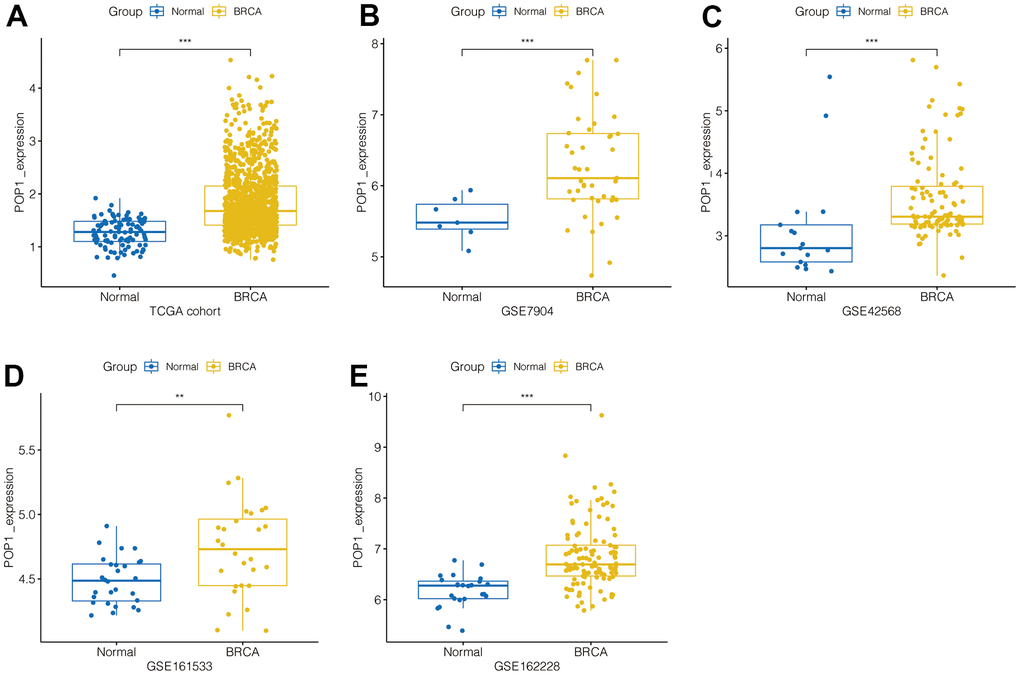 Firstly, in the TCGA BC cohort, POP1 expression was significantly higher in BC tissue than in normal breast tissue (Figure 1A). Subsequently, by using the GEO datasets, POP1 was overexpressed in BC tissues in the GSE7904 cohort, GSE42568 cohort, GSE161533 cohort, and GSE162228 cohort (Figure 1B–1E). Therefore, the POP1 was an up-regulated indicator in BC tissues from TCGA and GEO datasets.