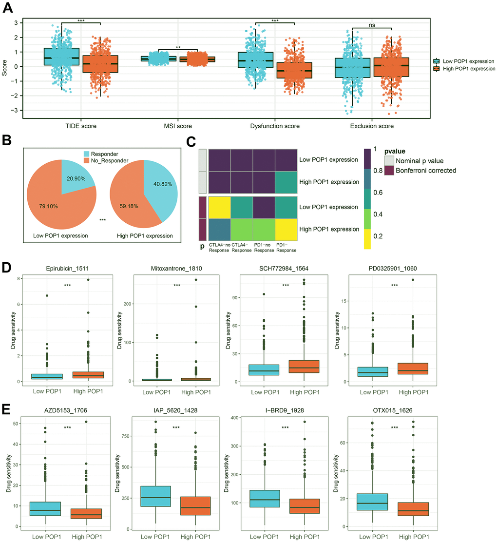Based on the TIDE algorithm, we calculated the TIDE score, microsatellite instability (MSI) score, dysfunction score, and exclusion score of all samples. The TIDE score was lower in the high-POP1 group, suggesting that immunotherapy might be more effective in the high-POP1 group (Figure 10A). Notably, the patients with the higher POP1 expression had a higher infiltration of immune characteristics. About 40.82% of high-POP1 group patients were effective for immunotherapy, while only 20.90% of low-POP1 group patients were effective for immunotherapy (Figure 10B). In addition, we performed a subclass mapping analysis to validate the immunotherapy prediction results. Consistent with these results, patients with high-POP1 expression might be sensitive to PD-1 therapy, while patients with low-POP1 expression might not be sensitive to CTLA-4 therapy (Figure 10C). Finally, IC50 estimates were performed for each sample of 179 drugs in the GDSC database by the R “oncoPredict” package and identified drugs with significant sensitivity differences in the two groups. Figure 10D, 10E suggested 4 drugs with the most obvious difference in sensitivity between high- and low-POP1 groups.