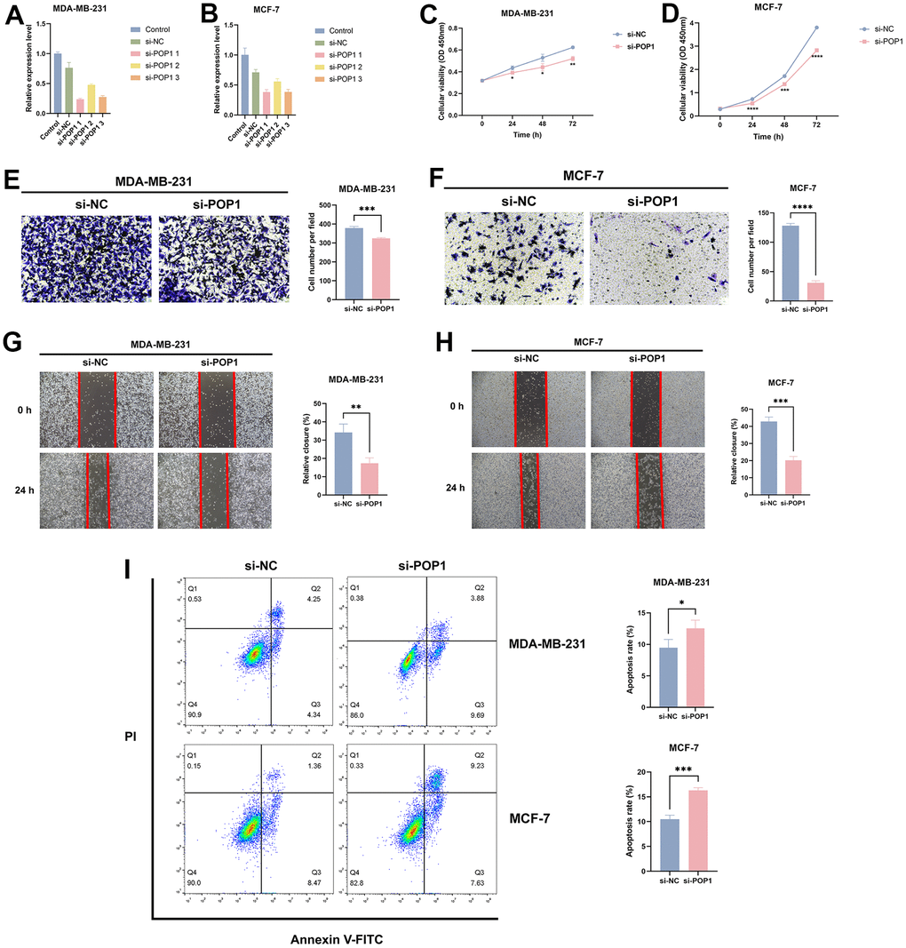 For an in-depth investigation of the POP1 function in vitro, we detected the role of the POP1 gene in the viability and invasion of two cells. Firstly, siRNAs could significantly knock down POP1 expression (Figure 11A, 11B). CCK-8 analysis demonstrated that compared with the si-NC group, the knockdown of POP1 suppressed the proliferation of both cell types (Figure 11C, 11D). Then, the POP1 depletion reduced the invasion of both cell types (Figure 11E–11H). Finally, flow cytometry data demonstrated that POP1 remarkably suppressed BC apoptosis (Figure 11I).