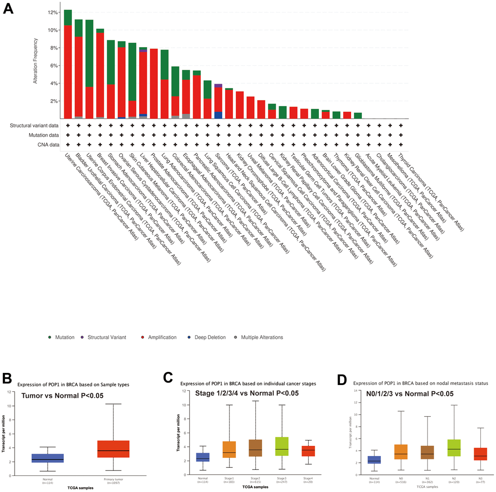 First, mutation analysis of the TCGA pan-cancer cohort revealed that POP1 mutation frequency in BC ranked fourth among all tumor types (Figure 2A). Subsequent analysis of the UALCAN database also suggested that the POP1 expression was higher in BC than in normal breast tissue (Figure 2B). Subgroup analysis demonstrated that POP1 was overexpressed in BC regardless of stage or lymph node metastasis status (Figure 2C, 2D).