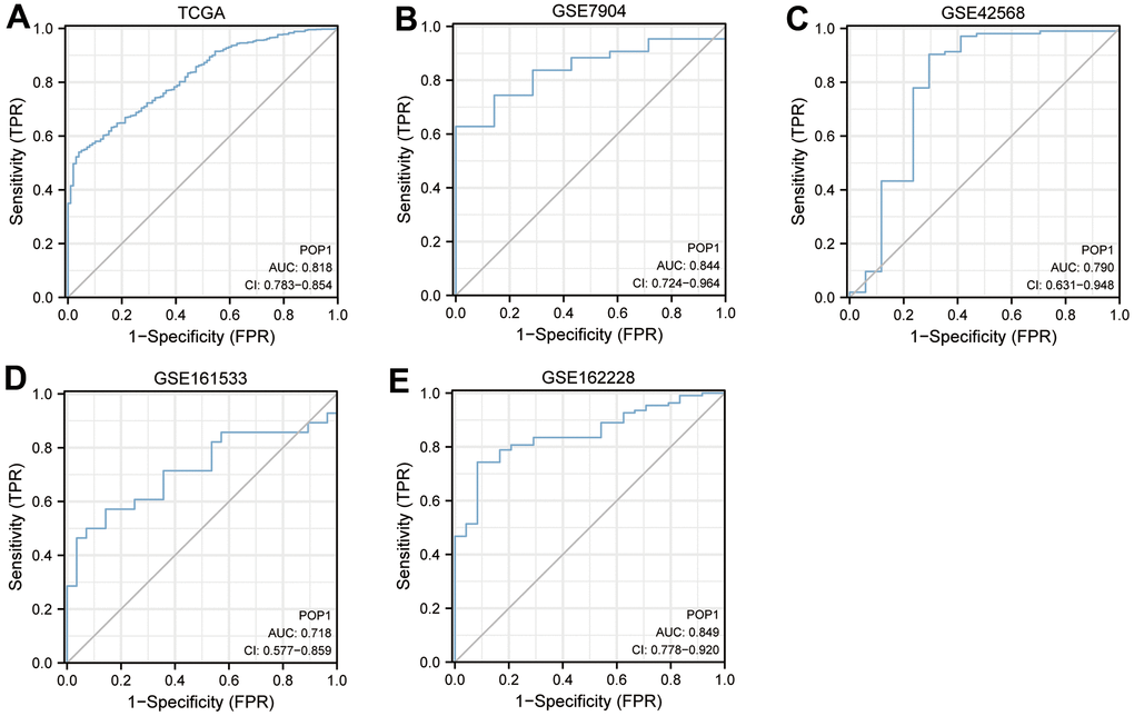 ROC curves of POP1 in different cohorts were constructed to evaluate the diagnostic accuracy of POP1