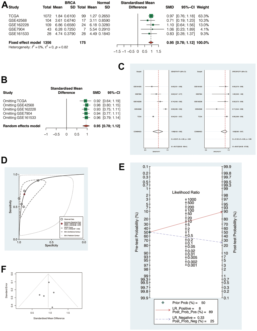 The above 5 cohorts (1 TCGA cohort, 4 GEO Cohorts) were jointly analyzed to exclude bias. The results suggested that the heterogeneity was less than 50%, so the fixed effect model was applied for analysis (Figure 4A, SMD = 0.95, 95% CI: 0.78, 1.12). This indicated that POP1 was still highly expressed in the BC group after the combination. Subsequently, it found that regardless of the exclusion of any cohort, the combined SMD was greater than 0 (Figure 4B). In addition, sensitivity analysis and specificity analysis also showed the same results, indicating that the results of the meta-analysis were relatively robust (Figure 4C). SROC curve showed that the results were reliable (Figure 4D, AUC = 0.90, 95% CI: 0.87-0.92). Begg test and Egger test did not find significant publication bias (Figure 4E, 4F).