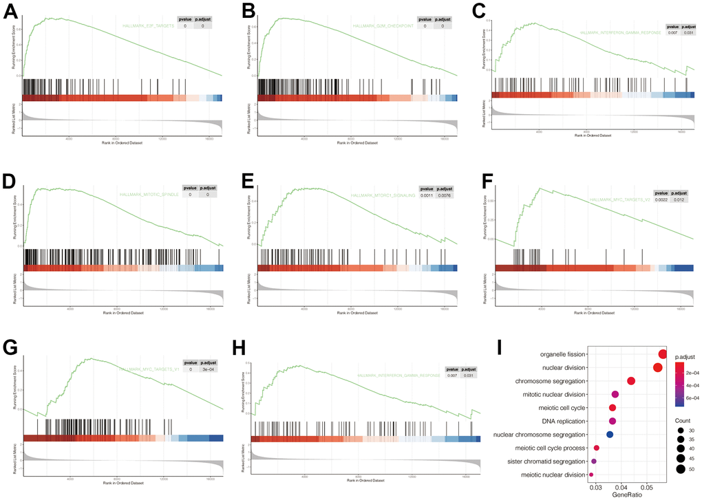 To explore the carcinogenic mechanism of POP1 in BC, it was necessary to analyze the relationship between POP1 and corresponding functions and signaling pathways. Firstly, GSEA analysis indicated that POP1 was significantly correlated with the E2F target, G2M checkpoint, interferon-gamma response, mitTORC1 signaling, and MYC targets (Figure 6A–6H). Subsequently, GO enrichment analysis verified that the differentially expressed genes were primarily interested in functional pathways, including organelle fission, nuclear division, and chromosome segregation (Figure 6I).
