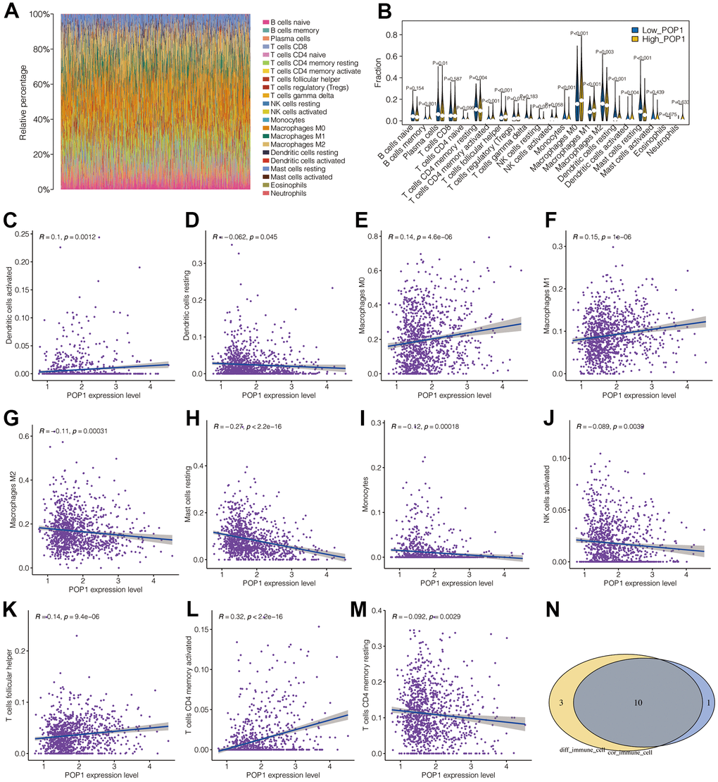 Figure 7A showed the landscape of immune cell infiltration in BC. Through this heat map, the abundance of each immune cell was intuitively observed. Figure 7B presented different analysis results of immune cell infiltration in the two groups. T cells CD4 memory resting, T cells CD4 memory activated, Plasma cells, T cells regulatory (Tregs), T cells Follicular helper, natural killer (NK) cells resting, mast cells resting, macrophages M0, macrophages M1, macrophages M2, monocyte, dendritic cells (DCs) resting and DCs activated were differently infiltrated between the high- and low-POP1 group. Subsequent analysis of correlation verified that POP1 expression was related to many immune cells (Figure 7C–7M). Venn diagram intersected the differentially infiltrated immune cell types with highly correlated immune cell types, resulting in 10 immune cell types (Figure 7N).