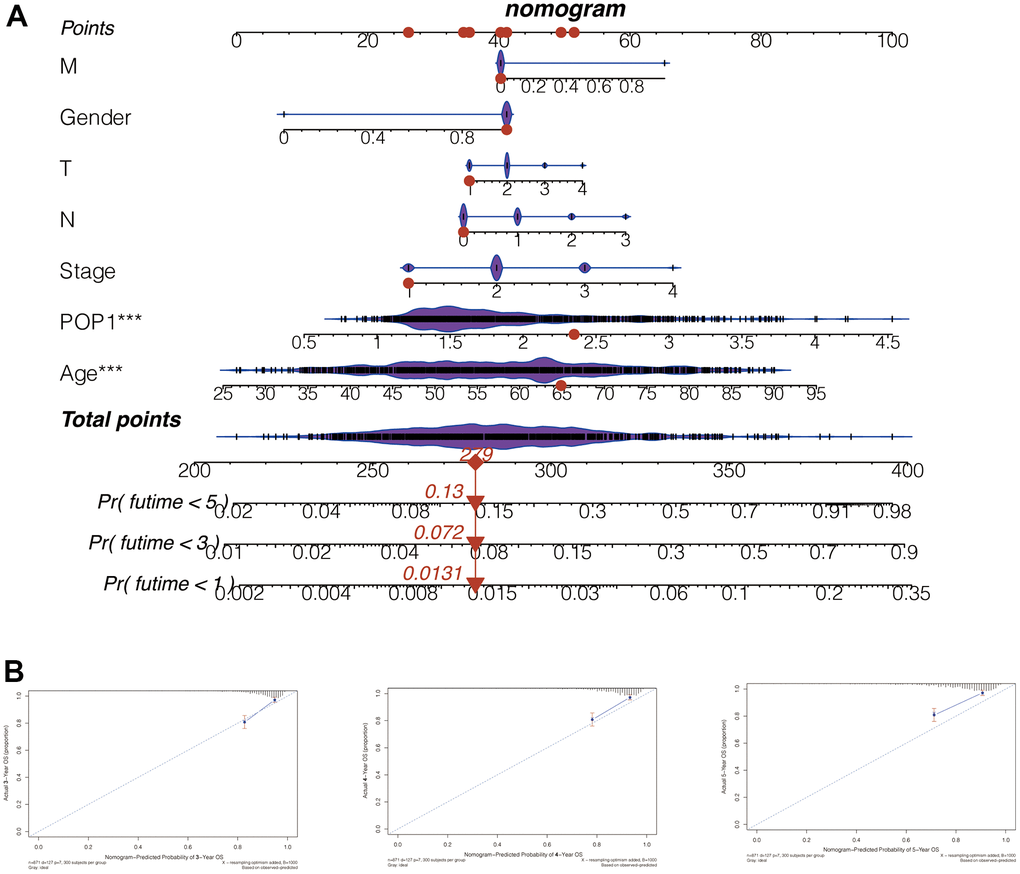 Subsequently, we constructed a nomogram for POP1 by integrating POP1 expression and clinical data. The 1-, 3-, and 5-year mortality forecasted by this nomogram was 0.0131, 0.0720, and 0.1300, respectively (Figure 8A). Based on the agreement between observed and predicted values, a nomogram calibration diagram of the training cohort was established. The 3-, 4-, and 5-year calibration curves verified the accuracy of the nomogram results (Figure 8B).