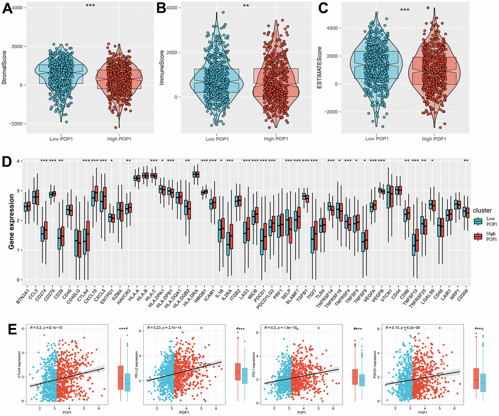 Calculate 3 scores for all samples of BC according to the ESTIMATE algorithm. All three scores were found to differ significantly between the high- and low-POP1 groups (Figure 9A–9C). Considering the vital role of ICB therapy in the tumor, 53 checkpoint-relevant genes were screened for differential expression analysis in the samples. The expression of most immune checkpoints differed significantly in the two groups (Figure 9D). Meanwhile, the correlation between POP1 and the four most common immune checkpoints suggested that POP1 expression was positively related to the expressions of CTLA-4, PD-1, PD-L1, and PD-L2 (Figure 9E).