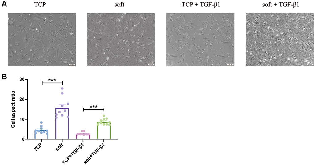 To explore the effect of soft substrates on FBs, we selected healthy, easily cultured and accessible hFFs, which was developed on either TCP or soft substrates, the elastic modulus of the soft substrates was reported to be 500-1000Pa [25]. At the meantime, the hFFs have been divided into different group based on whether TGF-β1 is added. The cell morphology of the four groups was observed and the aspect ratio was counted, and it was found that after culturing hFFs on TCP and soft substrates with or without TGF-β1, the soft substrates made the boundary of hFFs more distinct, three-dimensional, and slender (Figure 1A), with significant increased aspect ratio (Figure 1B), indicating that the soft substrates had a certain effect on hFFs, and which BPs are specifically affected need further analysis.
