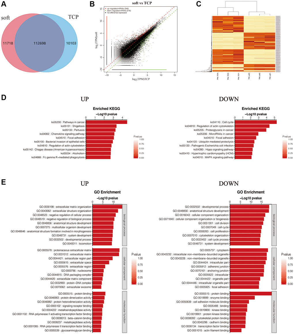 To explore the BPs and signaling pathways of hFFs that can be altered by soft substrates, we performed mRNA transcriptome sequencing of hFFs cultured on TCP and soft substrates for 24 h, and found that the number of genes co-expressed by soft and TCP was 112,698, the gene expression numbers specific to soft and TCP were 11718 and 10103, respectively (Figure 2A). The number of differentially expressed genes was large, which was not conducive to subsequent analysis. Therefore, the differential expression was screened. It was considered that |log2foldchange|≥2 was a significantly differentially expressed gene and was used for subsequent analysis. Among them, the number of up-regulated differentially expressed genes was 349, and the number of down-regulated differentially expressed genes was 516 (Figure 2B). The analysis of the inter-sample repeatability of these genes also found that the repeatability within the group was good, meeting the conditions for subsequent analysis (Figure 2C).