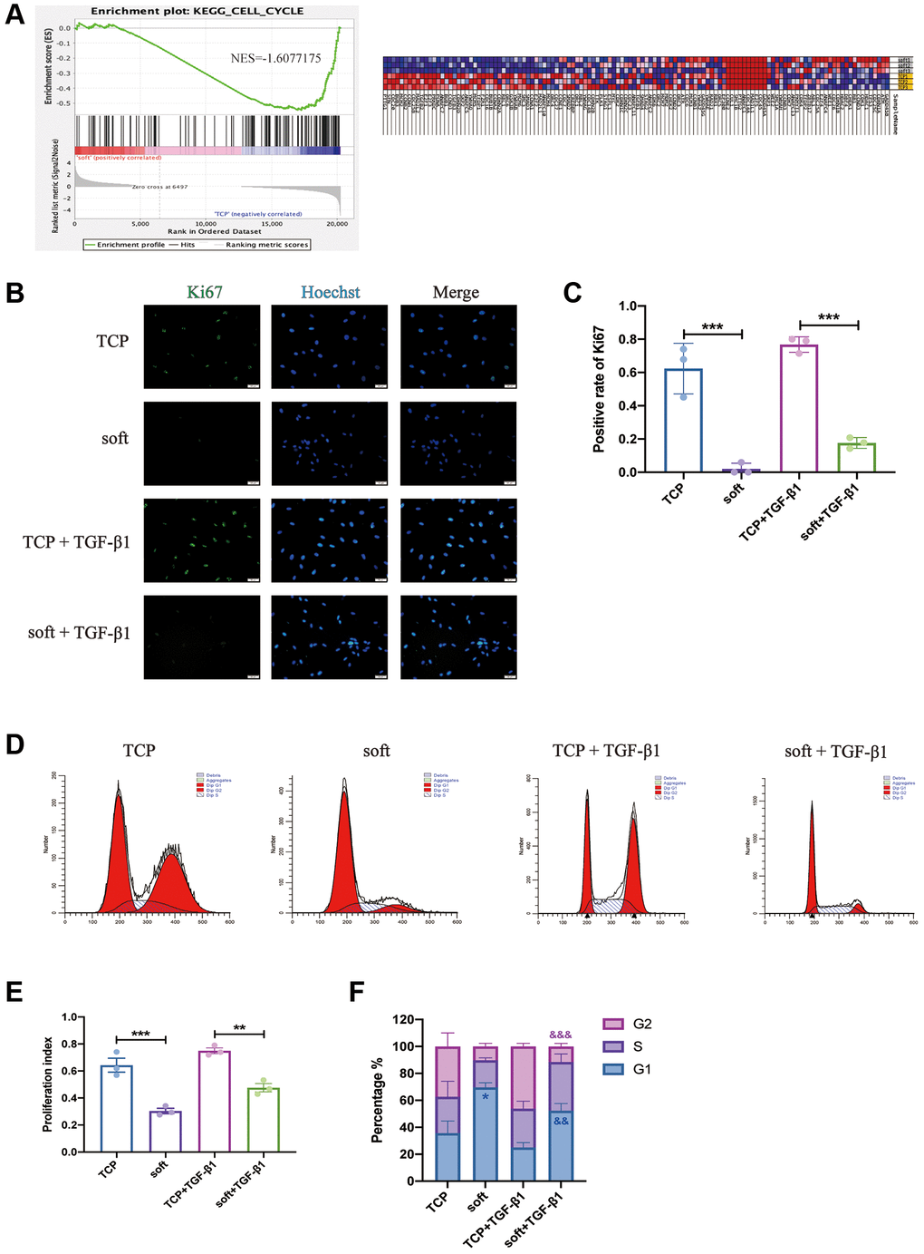 In order to explore the main biological effects of soft matrix on hFFs, we carried out gene set enrichment analysis (GSEA) and found that among the GSEA-enriched downregulated entries, cell cycle was the first one, and the enriched genes involved in this entry were shown in the heatmap (Figure 3A). To further validate this result, Ki67 immunofluorescence staining was performed on TCP and soft with or without TGF-β1 (Figure 3B), the results showed that the positive rate of Ki67 in the soft group was much lower than that in the TCP group with or without TGF-β1 (Figure 3C). The cell cycle of the four groups was examined (Figure 3D), and it was found that the soft substrates could reduce the PI of hFFs (Figure 3E), suppress the proportion of cells in G2 phase and increase the proportion of cells in G1 phase (Figure 3F), indicating that soft substrates inhibited hFFs proliferation.