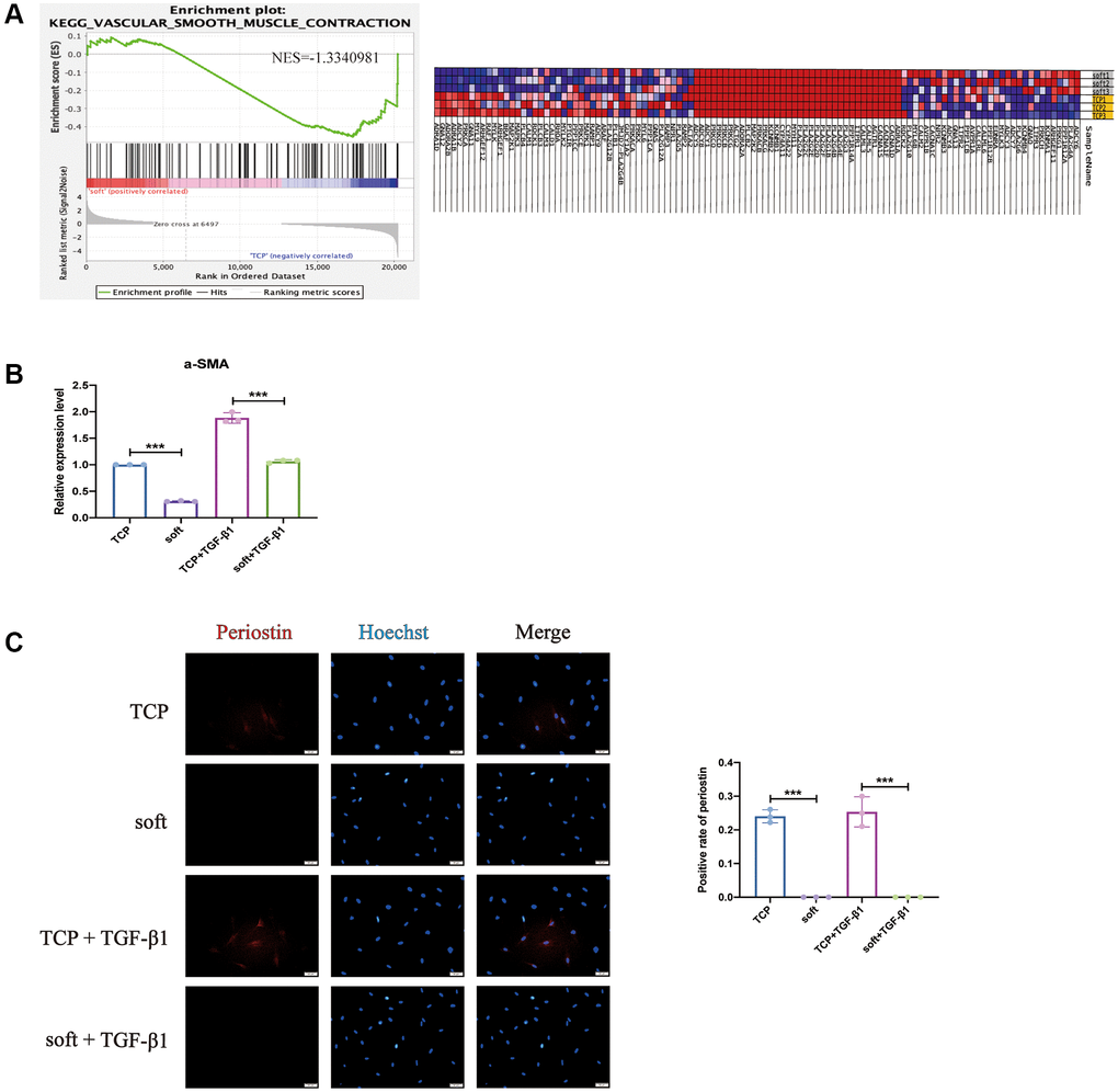 At the same time, the GSEA analysis also had enriched entries of vascular smooth muscle contraction that interest us, indicating that it had an impact on contractility, including the myofibroblast marker protein α-SMA (also known as ACTA2) [26] (Figure 4A), it was also considered to be one of the most stable cytoskeletal components of myofibroblasts [27], it was found that the soft substrates did significantly down-regulate its expression (Figure 4B). Periostin regulates myofibroblast differentiation and is persistently overexpressed in abnormal scars and other benign fibrous tissues proliferating with fibroblasts [28], while soft substrates Inhibit its expression, also in the presence of TGF-β1 stimulation (Figure 4C), it showed that the soft substrates may inhibit the differentiation and contraction of hFFs, and combined with the soft substrates inhibiting the proliferation of hFFs, these phenomena have certain significance for the treatment of skin scarring, sclerosis, fibrosis and other diseases related to the proliferation of FBs.
