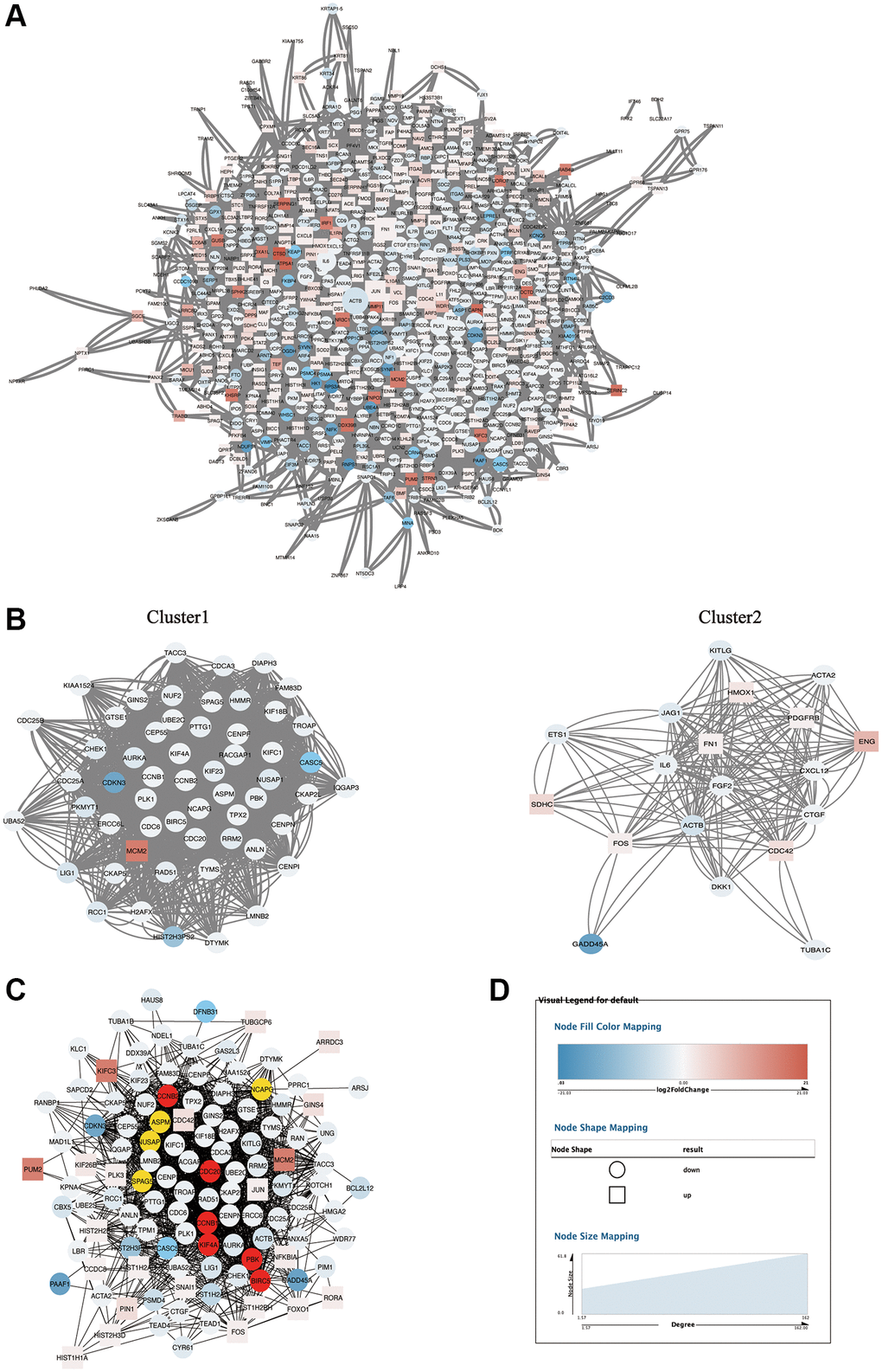 In order to explore the PPI network that can significantly change DEGs and select the major sub-networks, we used the string database to construct a PPI network of 698 DEGs and 9602 relations (Figure 5A). Interactions between key genes across the network were determined using Cytoscape plugins (MCODE and CytoHubba). Among them, MCODE obtained the top two clusters, there were 56 nodes and 2160 edges in cluster 1, the enrichment score was 39.273, and there were 19 nodes and 192 edges in cluster 2, the enrichment score was 10.667 (Figure 5B), they were identified from MCODE according to a scoring system. In addition, after importing the PPI network of Figure 5A into another plug-in CytoHubba, 114 key genes were identified by the MCC calculation method, with a total of 1536 edges (Figure 5C). In the above network, the circles represented down-regulated genes, the squares represented up-regulated genes, the blue to red color gradient of node full color corresponds to the log2foldchange in the range of -21.03 to 21.03, and the node size (26.02 to 61.80) corresponds to the degree (1.57 to 162) in Figure 5A network (Figure 5D), these genes obtained by MCODE and MCC algorithms were important in DEGs, but the number of genes was large, and further screening was needed.