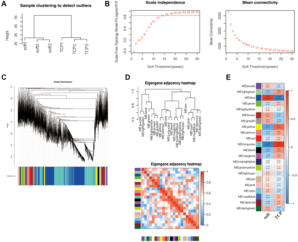 A total of 95139 transcripts were detected, the six duplicate samples were all 0 removed, the transcripts with the same gene name were merged (average), and then MAD was used for screening. The genes with the top 10,000 median deviation values were selected for one-step WGCNA network construction. In WGCNA, genes with similar expression patterns are classified into the same module, and the first principal component of the module is called the intrinsic gene of the module. Here we convert the experimental group into a 0–1 matrix, and we could estimate the correlation between the module and the trait by the expression of the module’s eigengenes. The correlation mode was set to Pearson correlation.