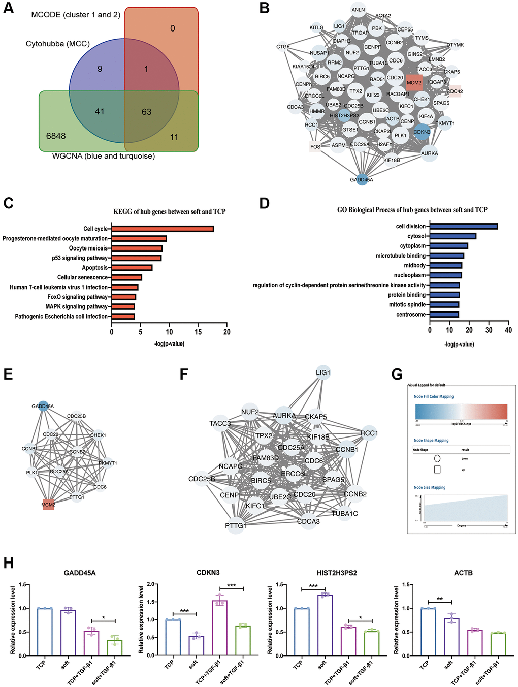 In order to find more critical hub genes, as well as their relationships and biological functions, we first intersected the 114 genes obtained by the MCC algorithm in CytoHubba, the 75 genes obtained by cluster1 and 2 in MCODE, and the 6963 genes in the blue and turquoise modules of WGCNA, and obtained 63 hub genes (Figure 7A) (Table 1), a PPI network was constructed for them to show their relationship (Figure 7B). KEGG and GO analysis of 63 hub genes found that cell cycle and cell division were the most significant entries (Figure 7C, 7D) (Tables 2, 3), indicating that the most significant effect of soft substrates on hFFs was cell proliferation, and the PPI networks of genes within the entries constructed to represent their relationship (Figure 7E, 7F). In the above network, circles represented down-regulated genes, squares represented up-regulated genes, the blue to red color gradient of node full color corresponded to log2foldchange in the range of -21.03 to 21.03, and node size (20.24 to 33.33) corresponded to the value of degree (5 to 58) in the network (Figure 7G), among them, α-SMA (ACTA2) was one of the 63 hub genes, indicating that the main effect of soft substrates on hFFs was to inhibit the proliferation and differentiation of hFFs. At the same time, we further verified the expression of the predicted top-ranked hub genes. Compared with TCP, soft substrates significantly inhibited the expression of CDKN3 and ACTB. In the presence of TGF-β1, soft substrates significantly inhibited the expression of GADD45A, CDKN3 and HIST2H3PS2 (Figure 7H), which indicated that our predicted hub genes also have certain reliability in the scar hyperplasia model in vitro. After a series of analyses, these hub molecules might become therapeutic targets for hypertrophic scars.