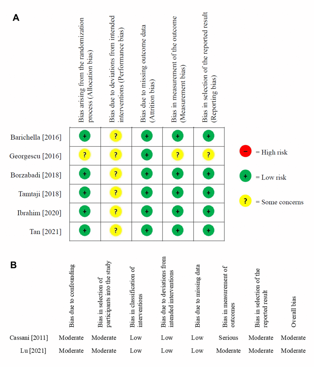The results of risk of bias assessment are shown in Figure 2A, 2B. Overall, risk of bias was medium across the included RCT studies. All RCT studies had risk of some concerns regarding performance bias. One trial had another medium risk of allocation bias, measurement bias, and reporting bias. For non-RCT studies, both had a moderate overall risk of bias, especially on bias due to confounding, bias in selection of participants into the study, bias in measurement of outcomes, and bias in selection of the reported result.