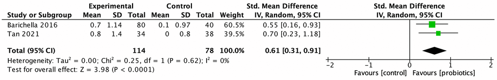 The meta-analysis of three studies demonstrated that the prescription of probiotics significantly increased weekly bowel movement (MD: 1.06, 95% CI: 0.61–1.51, p < 0.001, I2 = 40%; Figure 3). Stool consistency was evaluated in two studies, which presented a significant normalization of stool consistency (SMD: 0.61, 95% CI = 0.31–0.91, I2 = 0%; Figure 4).