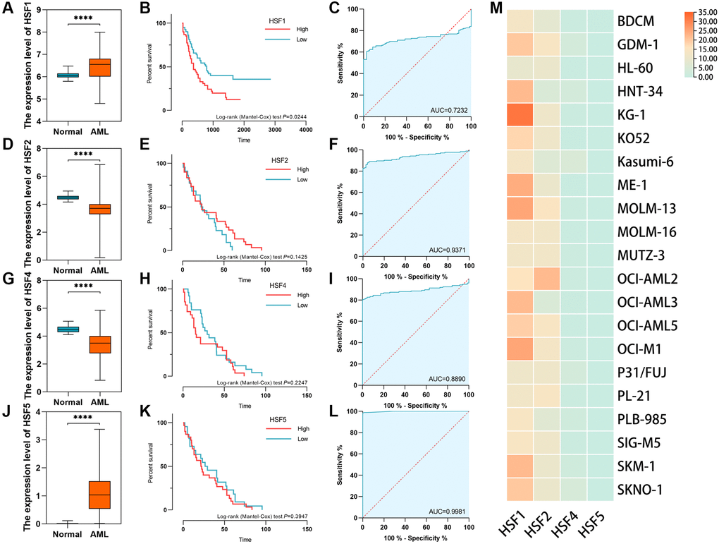 The HSF family includes HSF1, HSF2, HSF4 and HSF5. The expression level, diagnostic efficacy and prognostic significance of HSFs in AML were detected based on the data sourced from TCGA and GTEx. Expression levels were analyzed for normality using the Kolmogorov–Smirnov test. An unpaired t test was used for independent samples, and the Mann–Whitney test was used if the assumptions of normality for the t tests were not fulfilled. The expression levels of HSF1, HSF2, HSF4, and HSF5 in AML cell lines was further examined in CCLE. The ROC curve was then generated to evaluate the diagnostic value of HSF1 in AML based on data from TCGA. An AUC closer to 1 means better classification of the samples, and indicates a test of perfect diagnostic value, whereas an AUC of 0.5 indicated no diagnostic value.