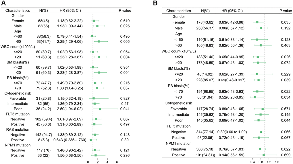 High (top 50%) and low (bottom 50%) HSF1 expression groups were divided according to the median expression of HSF1. OS of the high expression group and the low expression group was assessed using the Kaplan-Meier method by log-rank test based on data sourced from TCGA. Subsequently, AML patients were divided into different subgroups based on clinical variables, and the prognostic value of HSF1 among different subgroups was assessed to further elucidate the prognostic significance of HSF1 in AML patient subgroups.