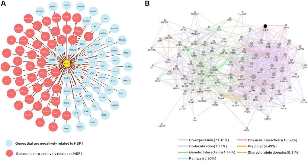 LinkedOmics (http://www.linkedomics.org/login.php), a database containing multiomics data and clinical data for 32 cancer types and a total of 11,158 patients from TCGA project [39]. Genes related to HSF1 expression in AML were screened in linkedomics using a Pearson's correlation. The top 50 genes positively and negatively associated with HSF1 expression were collected for further analysis. Cytoscape software (version 3.9.1) was used for visualization [40].