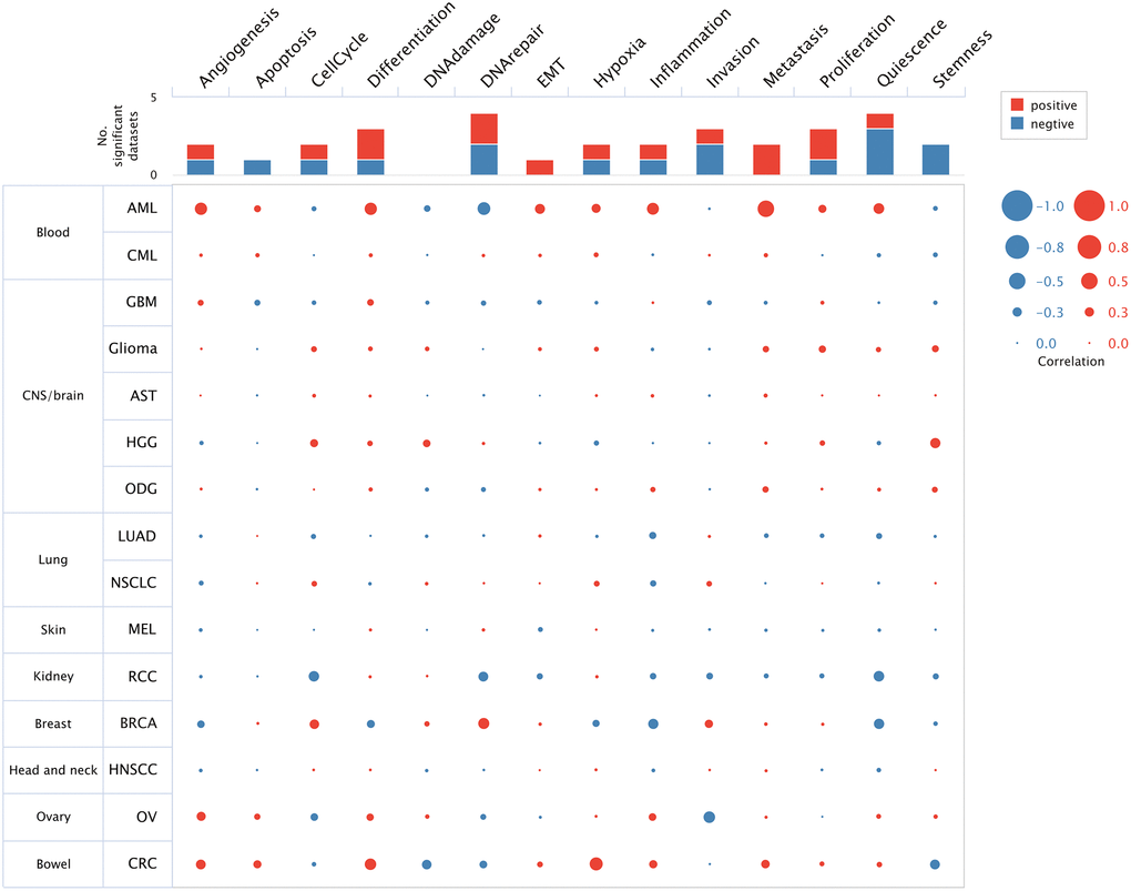 CancerSEA (http://biocc.hrbmu.edu.cn/CancerSEA/) is an integrative database depicts functional states of cancer cells at a single–cell resolution, covering 14 functional phenotypes of 41,900 cancer single cells from 25 cancer types [38]. In order to explore the underlying role of HSF1 in leukemogenesis, CancerSEA was used for functional analysis based on single–cell level. The correlation between HSF1 and functional states in AML, including invasion, metastasis, proliferation, angiogenesis, apoptosis, stemness, cell cycle, differentiation, DNA damage, DNA repair, hypoxia, epithelial–mesenchymal transition, inflammation and quiescence was investigated.