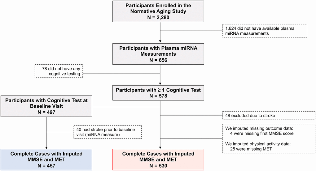 We first assessed the cross-sectional relationship between each of the detectable plasma miRNAs and MMSE score among men with MMSE measured at their baseline visit (N = 457, Figure 1 blue box) using linear regression models (Equation A). We then used linear mixed models with random intercepts for individual to assess the association between plasma miRNAs and longitudinal changes in cognition (N = 530, Figure 1 red box). Mixed models allow for differences in the number of repeated measures across participants; therefore, both persons with a single cognitive assessment and those with multiple assessments are included in our dataset and contribute to our primary estimates. The outcome for this analysis was MMSE score for subject i at visit j. The models included a linear term for time since the baseline assessment (i.e., follow up time) and an interaction term for plasma miRNA and follow up time; this cross-product represents the association between a given miRNA and rate of change in MMSE over time (Equation B).