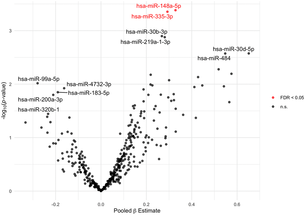 Analyses were performed separately for each plasma miRNA. We controlled for multiple comparisons using False Discovery Rates (FDR) and results were considered significant at FDRs < 0.05. We used R software (Version 4.0.5) for all statistical analyses [70].