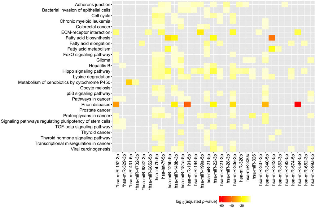 Table 3. Results of KEGG pathway enrichment analysis of experimentally validated gene targets of plasma miRNAs cross-sectionally associated with MMSE: hsa-miR-148a-5p and hsa-miR-335-3p.
