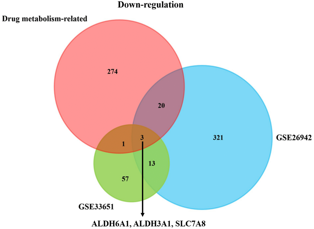 We explored two GC datasets from the GEO database and downloaded the statistics of the two datasets. The p-value < 0.05 was regarded as statistically significant. And the |logFC| was set as: |logFC| ≥ 1.0. The datasets were both divided into two groups: the normal group and gastric cancer group. Then, we could find that there existed 60 up-regulated genes and 357 down-regulated genes in the GSE26942 dataset. Moreover, there existed 630 up-regulated genes and 73 down-regulated genes in the GSE33651 dataset (Supplementary Table 1). Furthermore, the Venn plot (http://bioinformatics.psb.ugent.be/webtools/Venn/) was employed to explore the importance of the drug metabolism-associated genes in gastric cancer. As Figure 1 portrayed, three co-down-regulated genes, including ALDH6A1, ALDH3A1 and SLC7A8, could be important in the development of GC. And we found no co-up-regulated genes between the three datasets (Supplementary Figure 1).