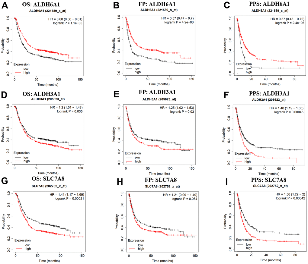 After picking out the three genes between the two datasets and the drug metabolism-associated gene dataset, we used the Kaplan-Meier plotter to investigate the prognostic values of ALDH6A1, ALDH3A1 and SLC7A8 in GC. Higher expression level of ALDH6A1 had a strong relationship with better OS (HR = 0.68, 95% CI = 0.58-0.81, p = 1.1e-05), FP (HR = 0.57, 95% CI = 0.47-0.7, p = 4.9e-08), PPS (HR = 0.57, 95% CI = 0.45-0.72, p = 2.4e-06) (Figure 2A–2C). In addition, high expression of ALDH3A1 was correlated with poor OS (HR = 1.2, 95% CI = 1.01-1.43, p = 0.035), FP (HR = 1.25, 95% CI = 1.02-1.53, p = 0.03), PPS (HR = 1.48, 95% CI = 1.19-1.85, p = 0.00045 (Figure 2D–2F). Meanwhile, as shown in Figure 2G–2I, high level of SLC7A8 was linked with poor OS (HR = 1.41, 95% CI = 1.17-1.69, p = 0.00021) and PPS (HR = 1.56, 95% CI = 1.22-2, p = 0.00042). Nonetheless, the expression level of SLC7A8 was not related to the FP (p > 0.05). Thus, we could suspect that ALDH6A1 had the great potential to be a prognostic prediction biomarker.