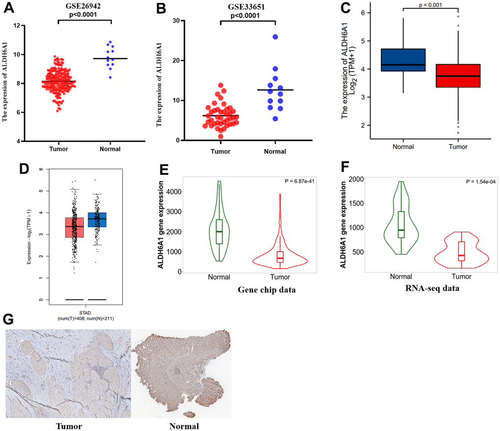 Two GSE datasets indicated that the level of ALDH6A1 expression was downregulated in gastric cancer (p < 0.0001) (Figure 3A, 3B). Likewise, the picture from Xiantao Xueshu (https://www.xiantao.love/) has conveyed that the expression of ALDH6A1 was lower in GC group when compared to normal group (Figure 3C). Meanwhile, the GEPIA2.0 database has demonstrated the same result (Figure 3D). Additionally, the TNMplot database has clarified that the gene expression level of ALDH6A1 in GC group was low both from the gene chip data (p = 6.87e-41) and RNA-seq data (p = 1.54e-04) (Figure 3E, 3F). Furthermore, IHC analysis was applied to further clarify the downregulated expression level of ALDH6A1 in GC tissues (Figure 3G). The above findings demonstrated the decreased levels of ALDH6A1 in GC. Then, we investigated the correlation between ALDH6A1 expression and the clinical characteristics of GC patients through TCGA database. We found that ALDH6A1 expression was significantly linked with T stage (p = 0.043) and antireflux treatment (p = 0.033) (Table 3).