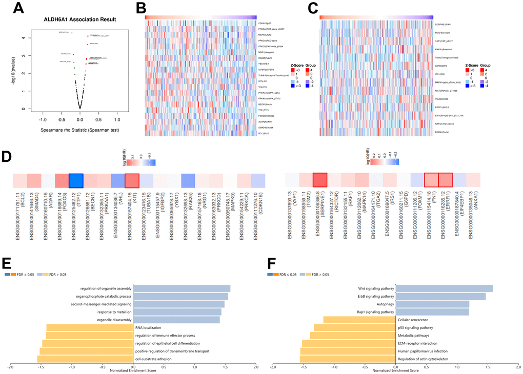 In order to further explore the correlation between ALDH6A1 expression and the development of GC patients, the LinkedOmics database was employed. The plot has portrayed the co-expressed genes that were positively and negatively correlated with ALDH6A1 (Figure 4A). What’s more, there were 18 genes that had a positive link with ALDH6A1 (Figure 4B and Supplementary Table 2). Similarly, there were 14 genes that were negatively related to ALDH6A1 (Figure 4C and Supplementary Table 3). As shown in Figure 4D, the survival heatmaps illustrated the top genes that were positively and negatively related to ALDH6A1 in GC, including TTF-1, KIT, SERPINE1, FN1 and ERRFI1. Furthermore, after investigating the Gene Ontology signaling pathway, we could find that the co-expressed genes mainly took part in some biological processes, like regulation of organelle assembly, organophosphate catabolic process, cell-substrate adhesion and positive regulation of transmembrane transport, etc. (Figure 4E). Moreover, KEGG signaling pathway implicated that the co-expressed genes mainly took part in Wnt signaling pathway, ErbB signaling pathway, regulation of actin cytoskeleton and human papillomavirus infection, etc. (Figure 4F).
