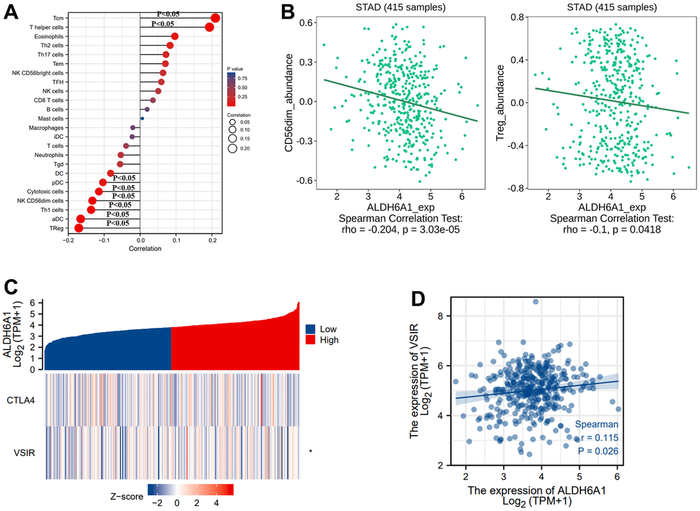 In addition, we evaluated the correlation between ALDH6A1 expression and immune regulation of gastric cancer through the statistics obtained from the TCGA database. The diagraph has depicted that ALDH6A1 had a positive correlation with the infiltration of T helper cells and T central memory (Tcm). At the same time, ALDH6A1 was negatively linked with Treg, activated DC (aDC), Th1 cells, NK CD56dim cells, Cytotoxic cells, Plasmacytoid DC (pDC) (Figure 5A). Meanwhile, Figure 5B has portrayed that ALDH6A1 had a negative relationship with CD56dim cells (Spearman r = -0.204, p = 3.03e-05) and Treg (Spearman r = -0.1, p = 0.0418). Additionally, the pictures have illustrated that the expression level of ALDH6A1 was positively linked with VSIR (Spearman r = 0.115, p =0.026) (Figure 5C, 5D).