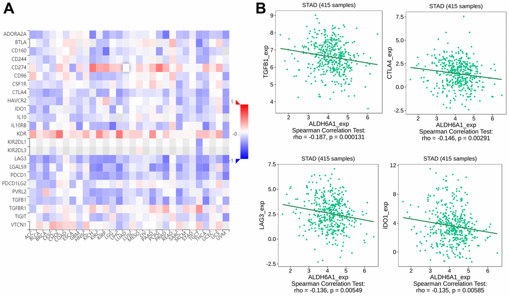 Similarly, we explored the correlation between ALDH6A1 expression and immunoinhibitors via the TISIDB database. The diagraph has illustrated the relationship between immunoinhibitors and the expression level of ALDH6A1 (Figure 6A). And the pictures have conveyed that the top four immunoinhibitors possessing the strong correlation with ALDH6A1 were TGFB1(Spearman r = -0.187, p = 0.000131), CTLA4 (Spearman r = -0.146, p = 0.00291), LAG3 (Spearman r = -0.136, p = 0.00549) and IDO1 (Spearman r = -0.135, p = 0.00585) (Figure 6B).