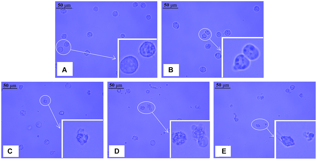As illustrated in (Figure 2A–2E), we found that the number of intact NB4 cells decreased, while the number of damaged cells increased, including cell contraction, nuclear condensation, and debris. The higher the concentration of realgar, the more significant the alteration of cell morphology. According to these results, realgar has a significant cytotoxic impact on NB4 cells.
