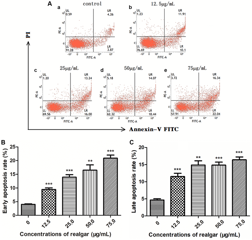 NB4 cells were plated at a density of 1.2 × 105 cells/well in 6-well plates, and then the cells were exposed to various concentrations (i.e., 0, 12.5, 25.0, 50.0, 75.0 μg/mL) of realgar (final volume: 3 mL) for 24 h. Next, the cells were collected at the specified time, gently resuspended by adding 195 μL Annexin V-FITC Binding Buffer (Beyotime, China), incubated with 5 μL Annexin V-FITC and 10 μL PI staining solution for 20 minutes at room temperature (20−25°C) and protected from light, and placed on ice for detection by flow cytometry (BD FACSVerse, USA). Annexin V-positive and PI-negative cells indicated the early stages of apoptosis, whereas both Annexin V- and PI-positive cells indicated the late stages of apoptosis.