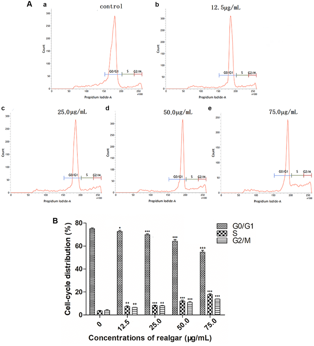 Cell cycle arrest analysis was carried out by flow cytometry after APL cells were exposed to different concentrations (0, 12.5, 25.0, 50.0 and 75.0 μg/mL) of realgar and stained with the DNA-specific dye ethidium bromide. In short, 1.2 × 105 cells were seeded in a six-well tissue culture plate, and various concentrations (0, 12.5, 25.0, 50.0 and 75.0 μg/mL) of realgar were added and incubated for an additional 24 h. Next, the cells were collected, washed with 1× PBS, and centrifuged. Then, the obtained cells were rewashed in PBS, fixed in 70% ice-cold ethanol and kept at −20°C. Finally, the cells were rewashed with PBS and stained with ethidium bromide, followed by analysis by flow cytometry (BD FACSVerse, USA).