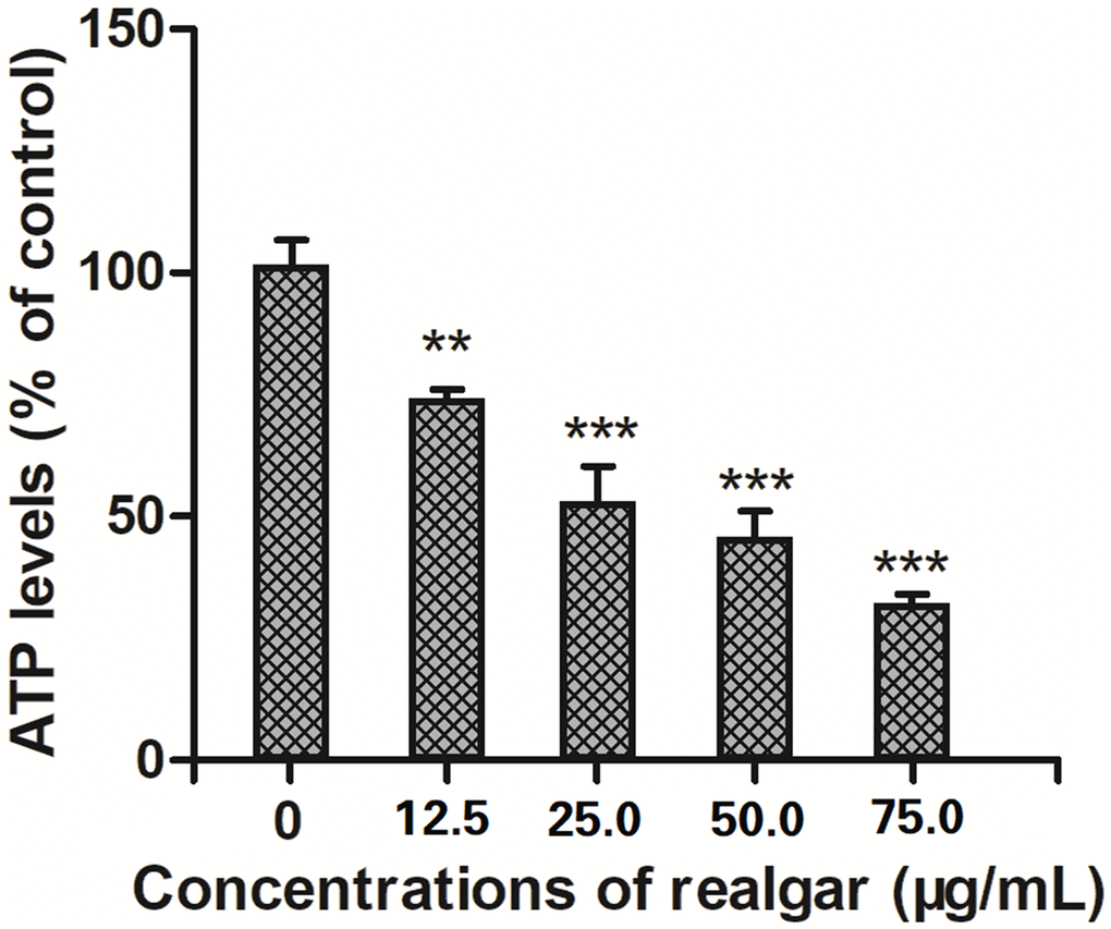 After 24 hours of treatment with different concentrations of realgar for 24 hours, the ATP levels in NB4 cells declined from 100% to 76.409%, 54.008%, and 48.825% (Figure 5). The results showed that ATP generation by NB4 cells was drastically inhibited following exposure to realgar.