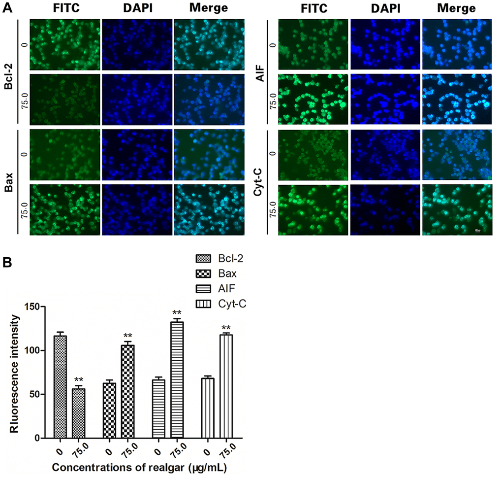 To determine the underlying mechanism of realgar-induced APL cell death, we evaluated the effect of realgar on mitochondrial function. The expression of Bcl-2, Bax, Cyt-C, and AIF at the mRNA and protein levels was evaluated before and after exposure to various concentrations of realgar using immunofluorescence, western blotting, and qPCR experiments. Our results showed that Bcl-2 was decreased and Bax, Cyt-C, and AIF were increased at the mRNA level in a concentration-dependent manner after APL cells were treated with realgar (Figure 6). In addition, Bcl-2 was decreased, whereas Bax, Cyt-C, and AIF were increased at the protein level in a concentration-dependent manner after APL cells were treated with realgar (Figures 7 and 8). Therefore, our findings demonstrate that realgar induces APL cell death mainly through the abnormal regulation of mitochondrial function and that Bcl-2, Bax, Cyt-C, and AIF play essential roles in realgar-induced APL cell death. Interestingly, Xie et al. found that after realgar treatment, the expression of Caspase-3, Caspase-9 and Cyt-C in NB4 cells increased, thus initiating the caspase-dependent intrinsic apoptosis pathway [48].