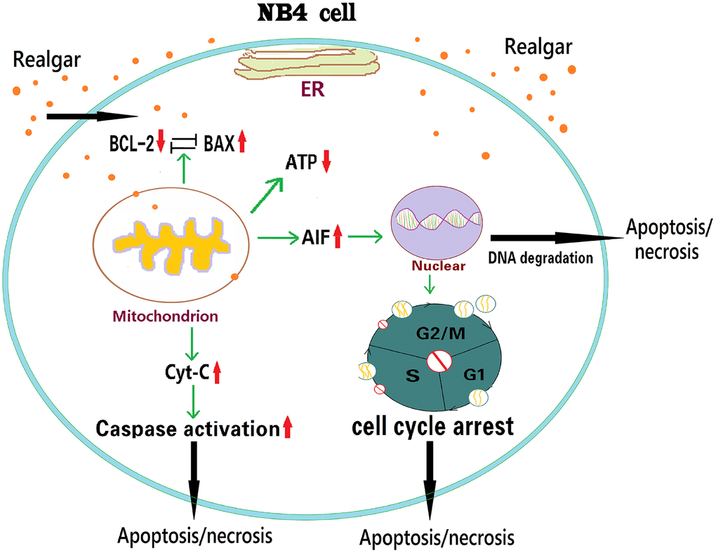 As shown in Figure 9, APL cells exposed to realgar reduced ATP production, destroyed the nucleus, and induced APL cell cycle arrest at the S and G2/M phases. In addition, realgar also decreased Bcl-2 expression while increasing Bax, Cyt-C, and AIF expression at the mRNA and protein levels. Our findings indicate that Bcl-2, Bax, Cyt-C, and AIF might play an essential role in realgar-mediated APL cell death.