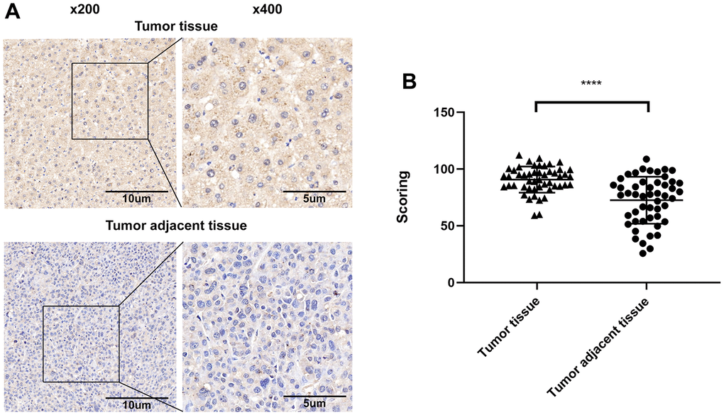 The expression of ALT1 in tissue microarrays containing 50 cases of HCC tissues and 50 cases of matched non-tumor adjacent tissues was evaluated via IHC. Darker staining occurred in the HCC samples, while lighter staining occurred in the non-tumor adjacent tissues (Figure 1A). The assessment of IHC scores demonstrated higher expression of ALT1 in HCC tissues (p<0.05) (Figure 1B).